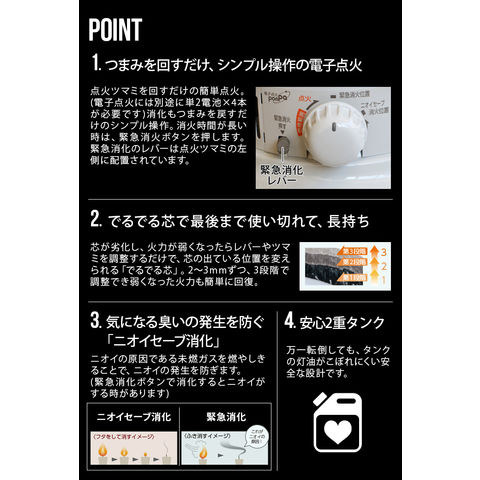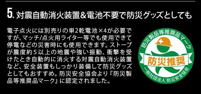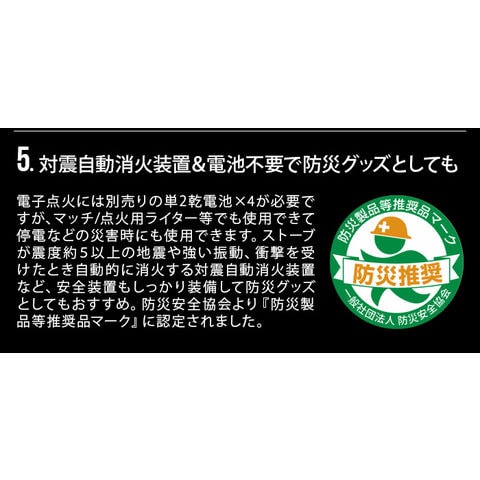 | ・電子点火 ・ニオイセーブ消火 ・対震自動消火装置 ・2重タンク構造 ・芯が長持ちでるでる芯 ・遠赤外線 |