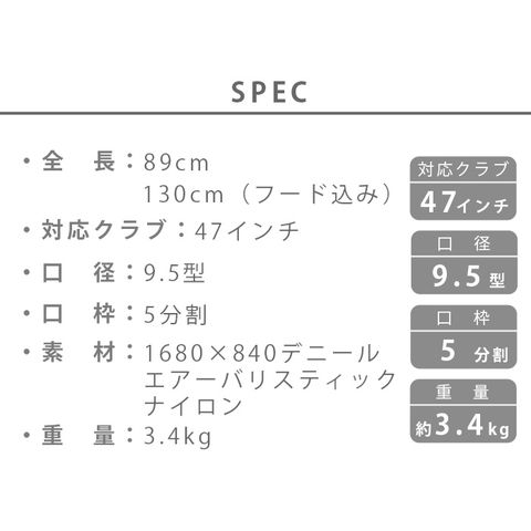 | ※ゴルフクラブ・ヘッドカバーは別売りです。 付属のフードは本体の収納部へ収納してのお届けとなります |