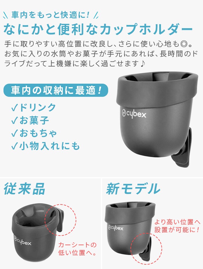カーシート専用カップホルダー2 サイベックスから、新仕様のカーシート専用カップホルダーが登場! 固定部が低い位置へと改良され、カーシートへ装着した際に本体位置が高くなり、ドリンクがより取り出しやすくなっています。 |