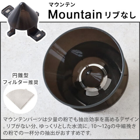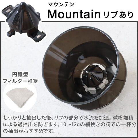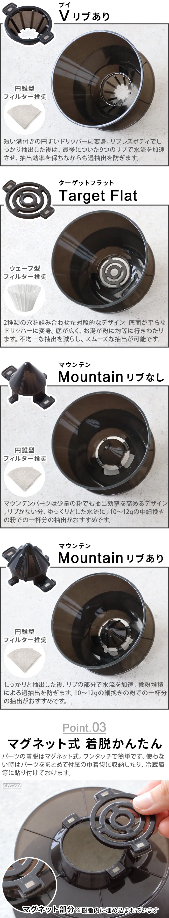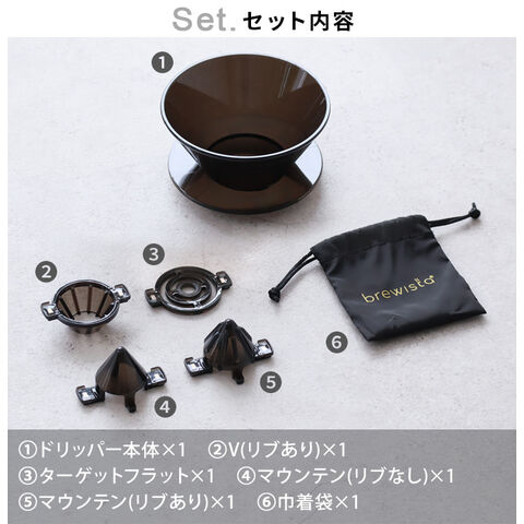 | ドリッパー本体×1 V(リブあり)×1 ターゲットフラット×1 マウンテン(リブなし)×1 マウンテン(リブあり)×1 巾着袋×1 |