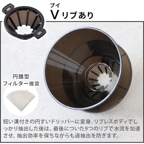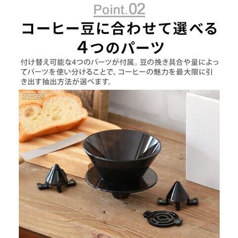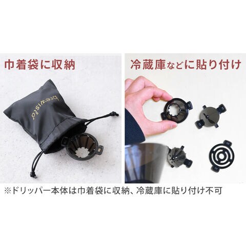 | 1つで4通りの抽出が可能 付属パーツはマグネット式で着脱簡単 付属パーツを収納できる巾着袋付き ※ドリッパー本体は巾着袋に収納不可 |