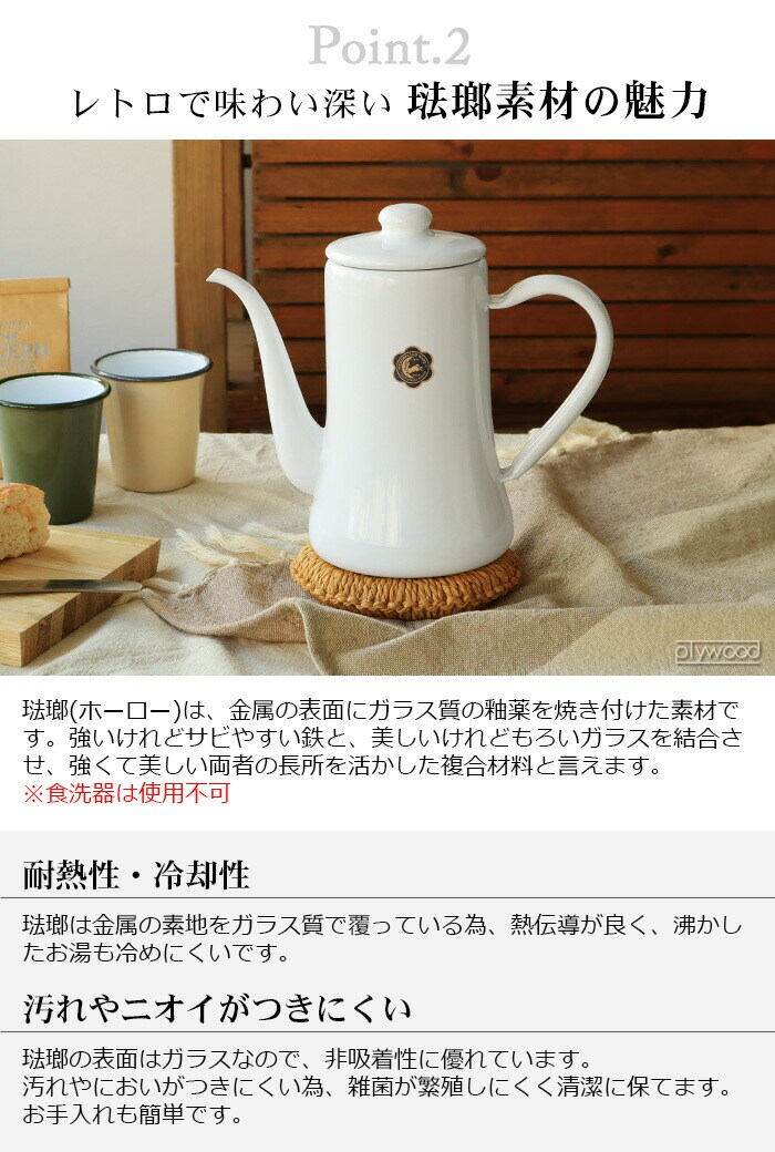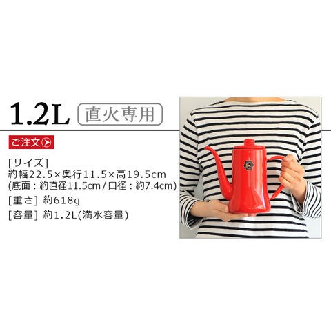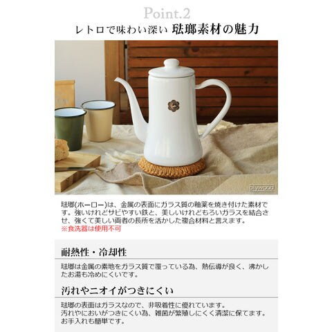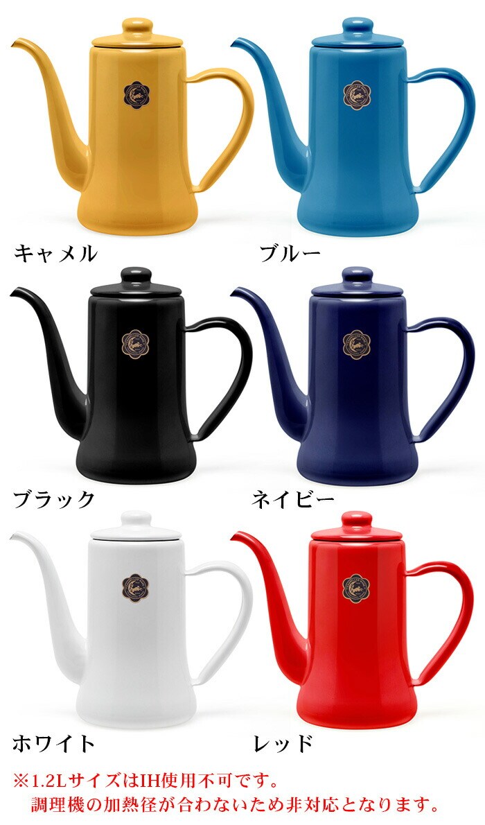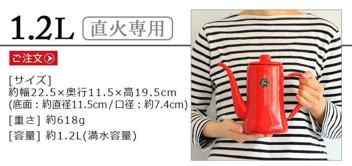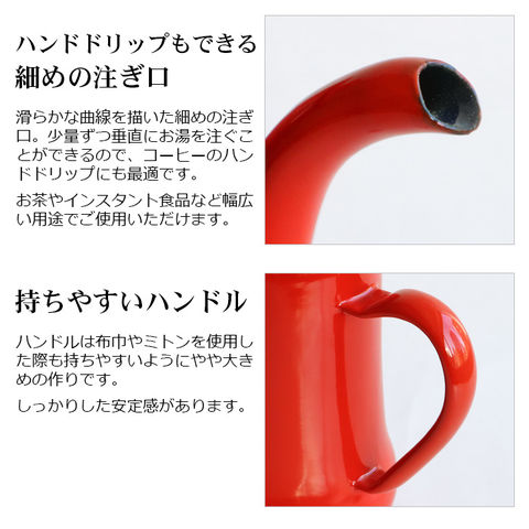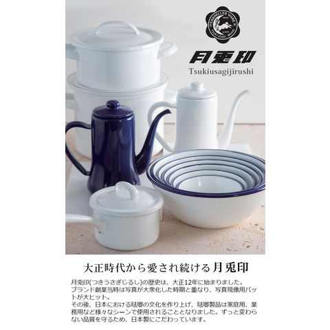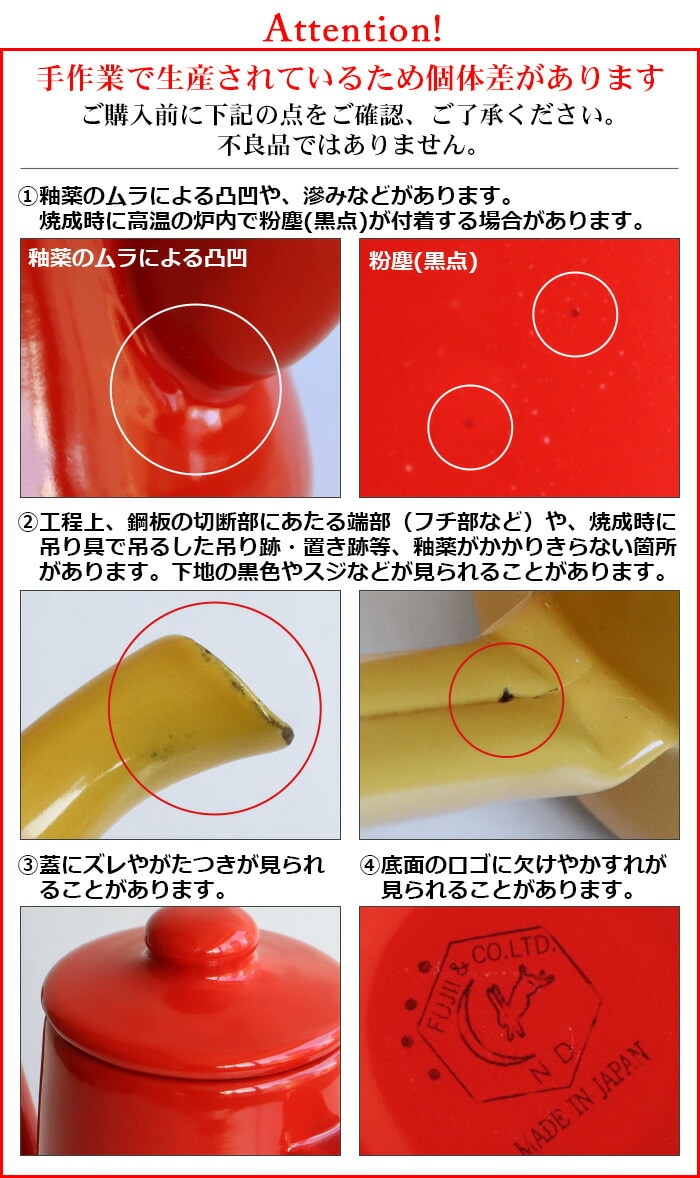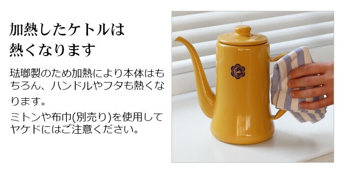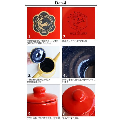 | 手作業で生産されているため塗装やサイズに多少の個体差があります。ご了承ください。 工程上、鋼板の切断部にあたる端部(フチ部など)や、焼成時に 吊り具で吊るした吊り跡・置き跡等、釉薬がかかりきらない箇所 があります。下地の黒色やスジなどが見られることがあります。 容量表示は満水容量です。直火に掛ける際は、満水容量の容量である7分目以下でご使用ください。入れ過ぎると熱湯の吹き出しなどが起こることがあります。 ストーブの上では使用しないでください。転倒や湯の吹き出しによるヤケドなどの危険があります。 ホーローはガラス質です。高温に熱した後、急に水などを入れて冷却しないでください。衝撃や落とすなどのショックを与えないでください。破損の原因となります。 ホーロー製のため加熱により本体はもちろん、ハンドルやフタも熱くなります。ミトンや布巾(別売り)を使用してヤケドにはご注意ください。 金属タワシ、研磨剤などのご使用は、表面を傷つけますのでご使用にならないでください。 コンロの五徳に乗らない、または安定感がない場合は、五徳の上に網や補助器具(別売り)等を置き、安全性を確かめてからご使用ください。 |