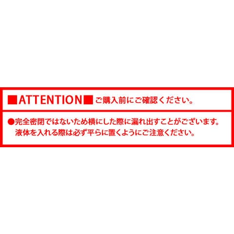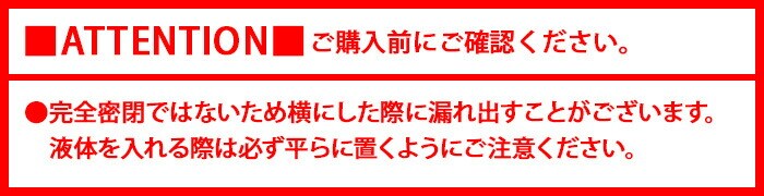 | 完全密閉ではないため横にした際に漏れ出すことがございます。液体を入れる際は必ず平らに置くようにご注意ください。 |