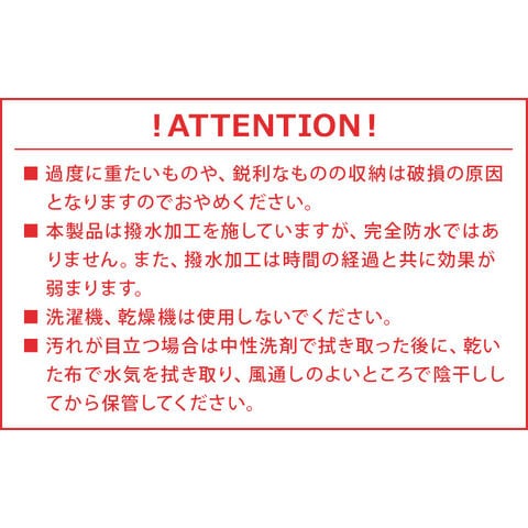 過度に重たいものや、鋭利なものの収納は破損の原因となりますのでおやめください。 本製品は撥水加工を施していますが、完全防水ではありません。また、撥水加工は時間の経過と共に効果が弱まります。 濡れたままの状態で使用・保管すると、色移りやカビが発生する可能性があり、生地が劣化しやすくなります。使用後は十分に乾燥させてから保管してください。 洗濯機、乾燥機は使用しないでください。 火気の近くでのご使用・保管はお避けください。 |