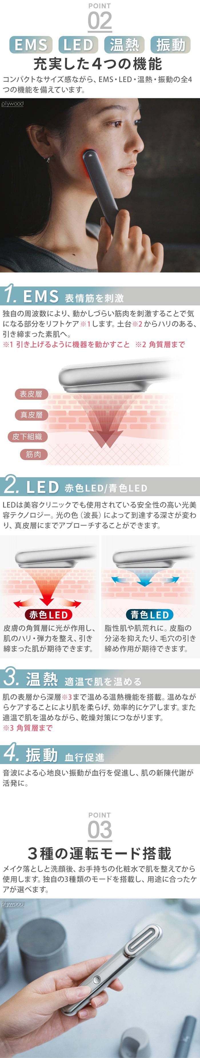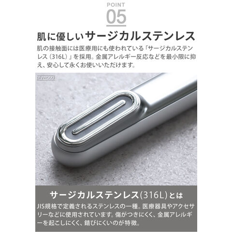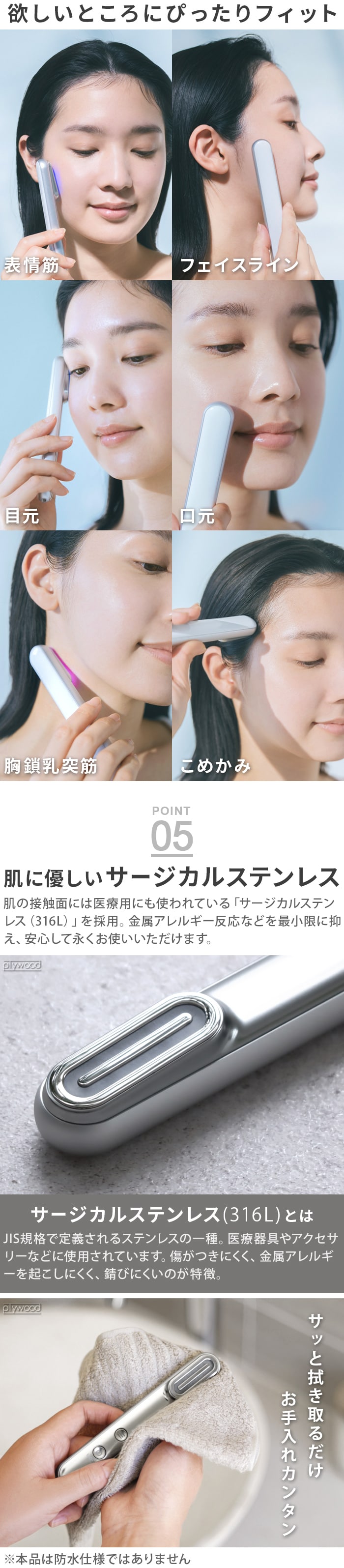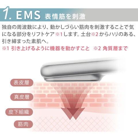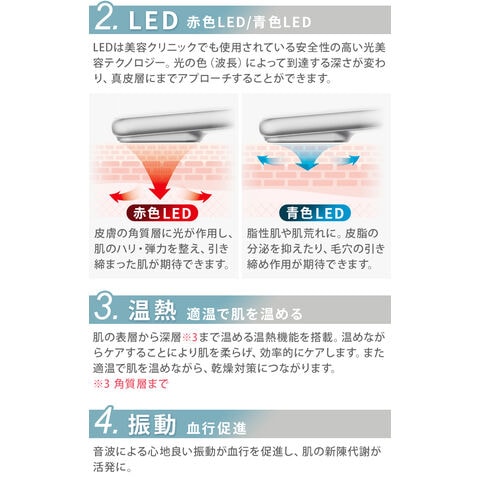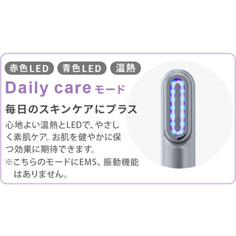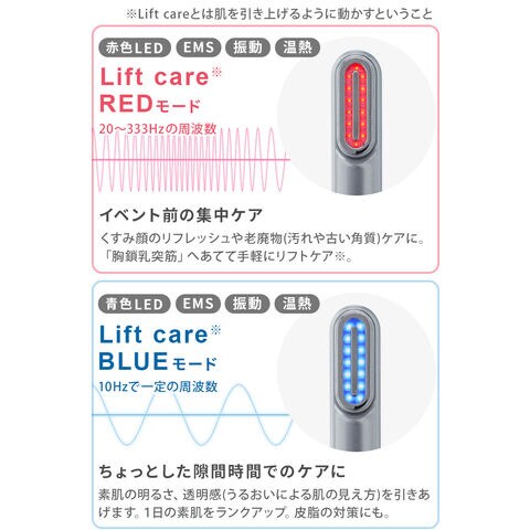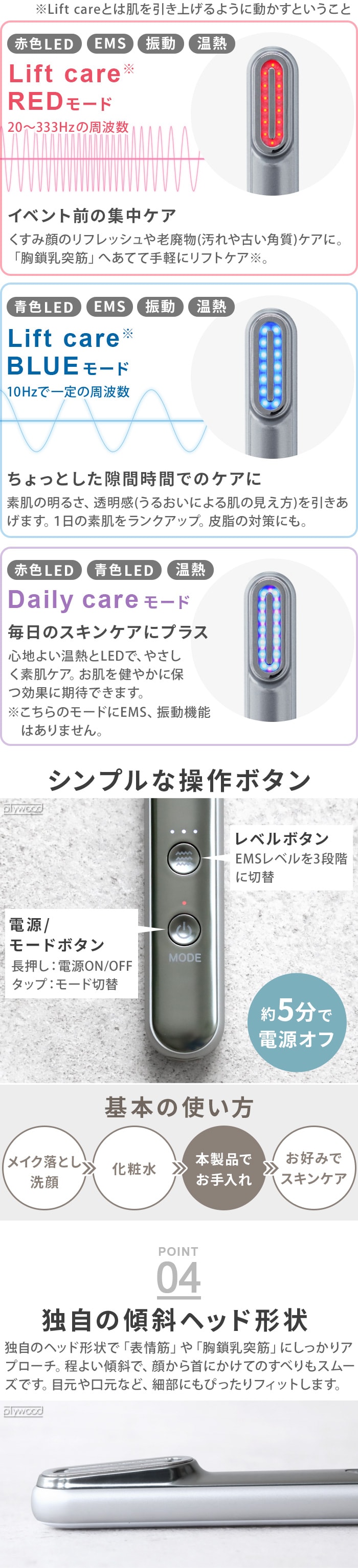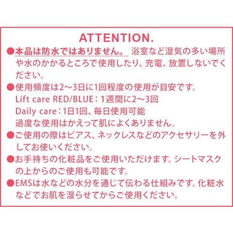 | 本品は防水ではありません。浴室など湿気の多い場所や水のかかるところで使用したり、充電、放置しないでください。 使用頻度は2~3日に1回程度の使用が目安です。 Lift care RED/BLUE:1週間に2~3回 Daily care:1日1回、毎日使用可能 過度な使用はかえって肌によくありません。 ご使用の際はピアス、ネックレスなどのアクセサリーを外してお使いください。 お手持ちの化粧品をご使用いただけます。シートマスクの上からのご使用も可能です。 EMSは水などの水分を通じて伝わる仕組みです。化粧水などでお肌を湿らせてからご使用ください。 お手入れの際はティッシュなどでヘッドに残った化粧品を拭き取ってください。ヘッドの汚れが落ちにくいときは、綿棒や水を含ませて硬く絞った布で拭き取ります。 ヘッド以外の汚れは乾いた布で拭き取ってください。 洗剤、アルコール、ベンジン、シンナー、除光液などは使用しないでください。 |