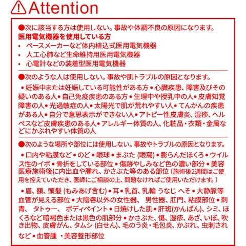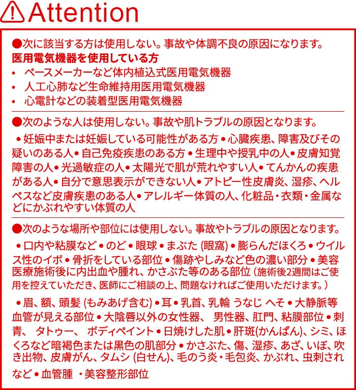 | ●次に該当する方は使用しない。事故や体調不良の原因になります。 医用電気機器を使用している方 ・ペースメーカーなど体内植込式医用電気機器 ・人工心肺など生命維持用医用電気機器 ・心電計などの装着型医用電気機器 ●次のような人は使用しない。事故や肌トラブルの原因となります。 妊娠中または妊娠している可能性がある方/心臓疾患、障害及びその疑いのある人/自己免疫疾患のある方/生理中や授乳中の人/皮膚知覚障害の人/光過敏症の人/太陽光で肌が荒れやすい人/てんかんの疾患がある人/自分で意思表示ができない人/アトピー性皮膚炎、湿疹、ヘルペスなど皮膚疾患のある人/アレルギー体質の人、化粧品・衣類・金属などにかぶれやすい体質の人 ●次のような場所や部位には使用しない。事故やトラブルの原因となります。 口内や粘膜など/のど/眼球/まぶた(眼窩)/膨らんだほくろ/ウイルス性のイボ/骨折をしている部位/傷跡やしみなど色の濃い部分/美容医療施術後に内出血や腫れ、かさぶた等のある部位(施術後2週間はご使用を控えていただき、医師にご相談の上、問題なければご使用いただけます。)/眉、額、頭髪(もみあげ含む)/耳/乳首、乳輪/うなじ/へそ/大静脈等血管が見える部位/大陰唇以外の女性器、男性器、肛門、粘膜部位/刺青、タトゥー、ボディペイント/日焼けした肌/肝斑(かんぱん)、シミ、ほくろなど暗褐色または黒色の肌部分/かさぶた、傷、湿疹、あざ、いぼ、吹き出物、皮膚がん、タムシ(白せん)、毛のう炎/毛包炎、かぶれ、虫刺されなど/血管腫・美容整形部位 |