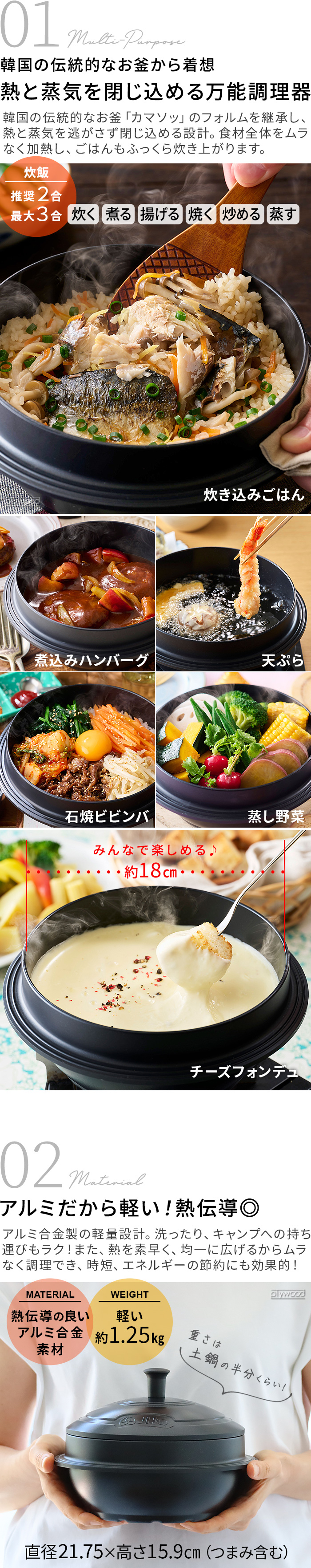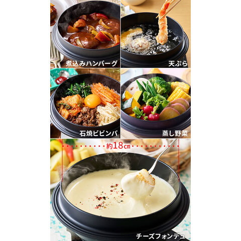| 約1.8L 水や食材を本体のフチまで入れて使用しないでください。吹きこぼれを防ぐため、内容量は全体の5~6分目を目安にしてください。吹きこぼれにより、火傷の危険や火が消失する可能性があります。 |