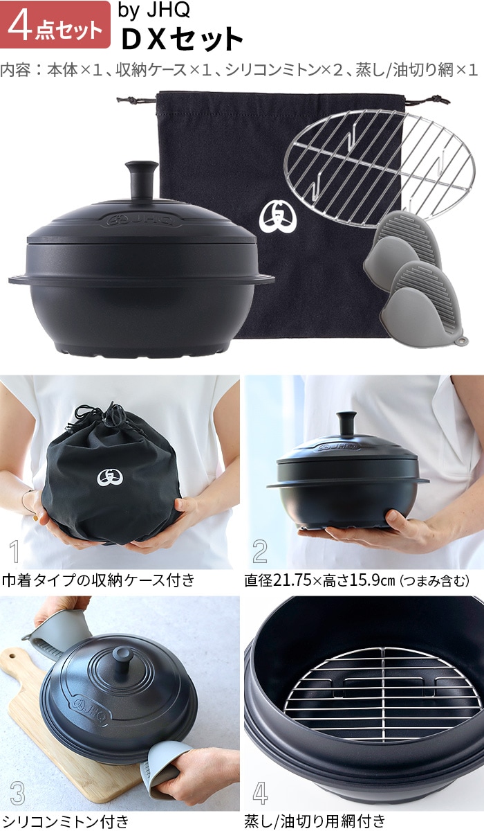 | ≪JHQマルチカマ単品≫ 本体×1 ≪JHQマルチカマ 収納ケース付≫ 本体×1、収納ケース×1 ≪JHQマルチカマ DXセット≫ 本体×1、収納ケース×1、シリコンミトン×2、蒸し/油切り用網×1 |
