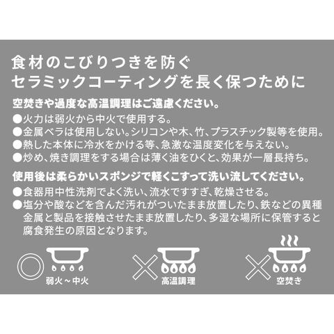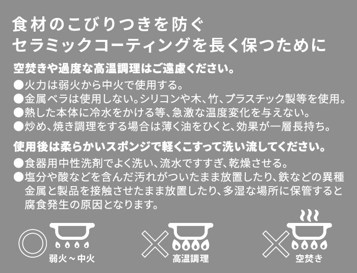 | ご使用後、水またはお湯で洗い流してください。洗剤をつけたスポンジでよく洗い、流水でよくすすいで水気をふき取り、乾燥させてください。その際、直火やガスなどで加熱して乾燥させないでください。 空焚きになり危険です。汚れが残ったままのご使用は焦げつきの原因となります。 お手入れの際、スチールタワシ、シンナー、ベンジン、クレンザー、磨き粉、アルカリ性洗剤(漂白剤、食器用洗浄機洗剤など)は使用しないでください。 酸性またはアルカリ性のものの使用は避けてください。腐食を避けるために調理後は早めに洗って乾燥してください。 お手入れが不十分ですと、腐食や損傷の原因になります。 塩分や酸などを含んだ汚れがついたまま放置したり、などの異種金属と製品を接触させたまま放置したり、湿気の多い場所での保存はしないでください。腐食発生の原因となります。 重ねて保存される場合は重ねるものの間にキッチンペーパーなどを挟んで保存してください。他の調理器物などを重ねて保存されるとコーティングがはがれたリキズつく場合があります。 食器洗浄機は使用しないでください。セラミックコーティングにキズがついたり劣化の原因になります。 |