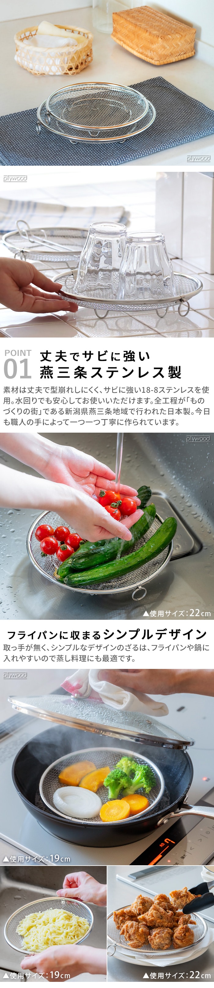 bws SELECTION すっきり暮らす 盆ざる ≪19cm・22cmセット 930009S≫ ビーワーススタイル 持ち上げフック付き 蒸しざる ステンレス フライパンに収まる 燕三条 日本製 水切りラック 食洗機対応 引掛け キッチン 野菜 食器 丸形 ギフト おしゃれ