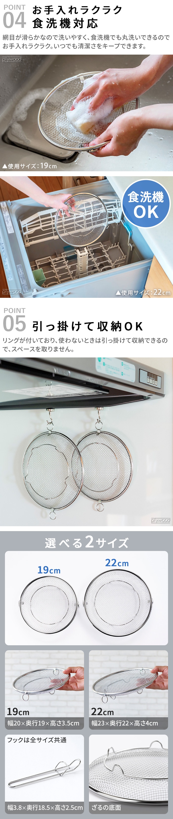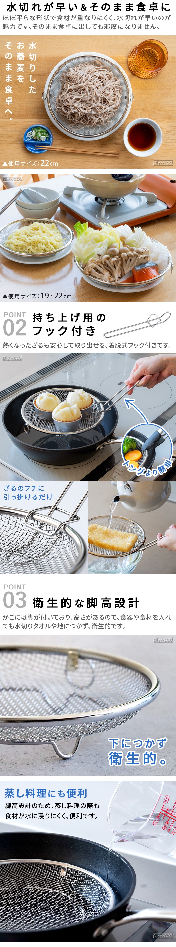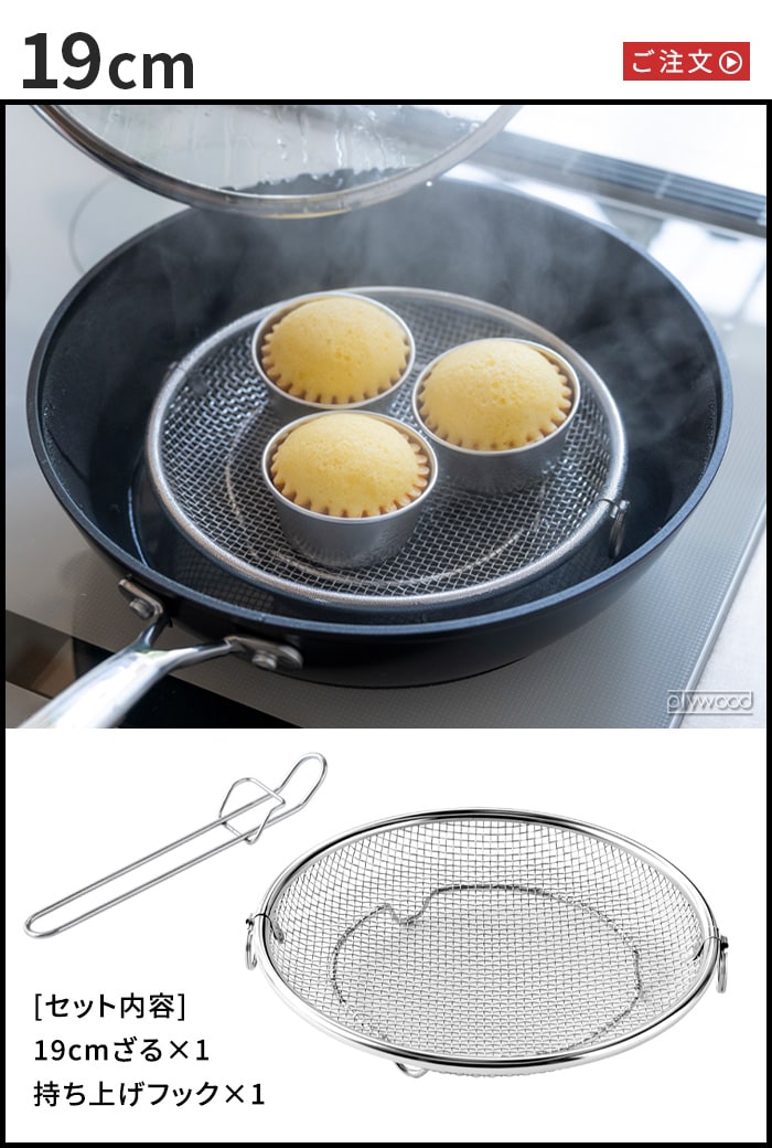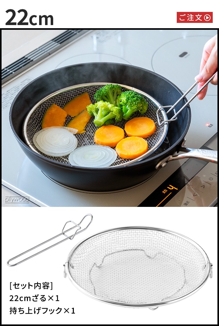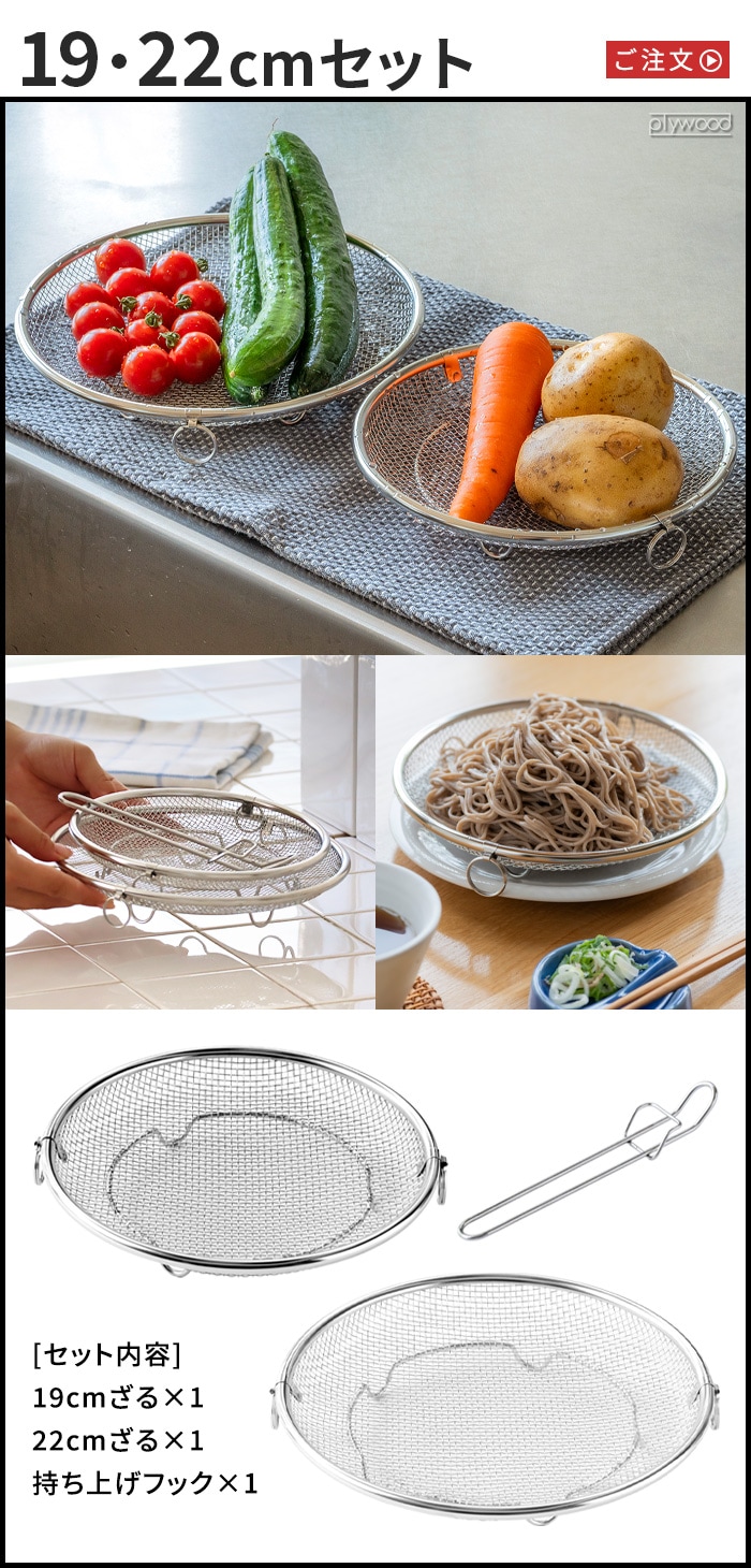 | ≪19cm≫ 19cmざる×1、持ち上げフック×1 ≪22cm≫ 22cmざる×1、持ち上げフック×1 ≪19&22cmセット≫ 19cmざる×1、22cmざる×1、持ち上げフック×1 |