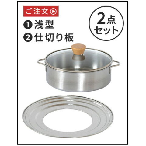 | 本体(浅型/深型)・ざる・仕切り板:ステンレス鋼 ガラス蓋:強化ガラス つまみ:木(ウレタン塗装) |