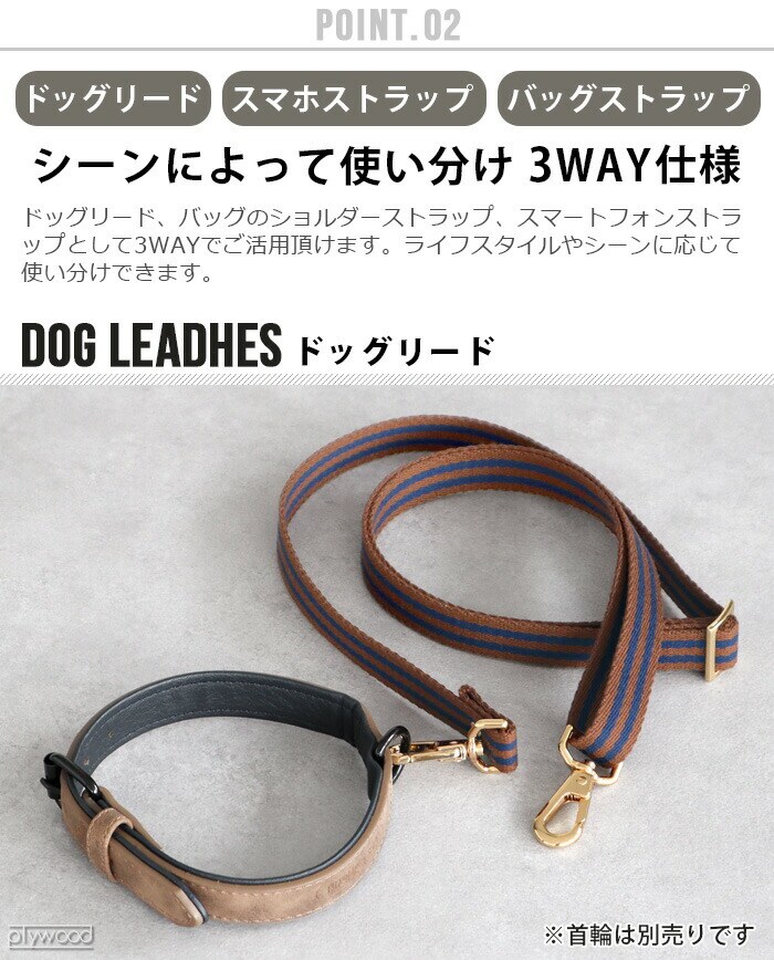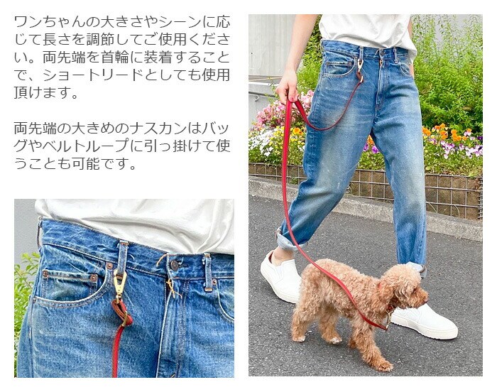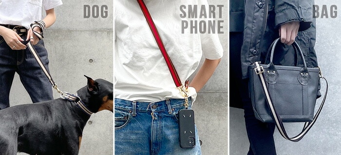 | テープの幅20mm、厚み2mm ドッグリード、バッグのショルダーストラップ、スマートフォンストラップとして使える3WAY仕様 両先端にナスカン付き。 |