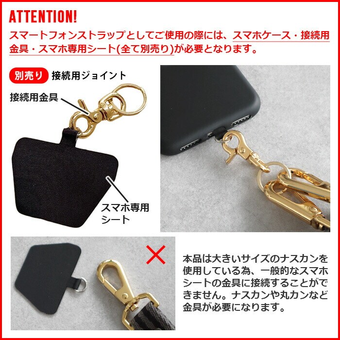 | こちらはストライプストラップのみの販売になります。 スマホケース・接続ジョイント・バッグ・首輪は付属しません。別売りです。 本品は大きいサイズのナスカンを使用している為、一般的なスマホ専用シートの金具に接続することができません。ナスカンや丸カンなど金具が必要になります。 カシメの色はストラップのカラーにより異なります。 |