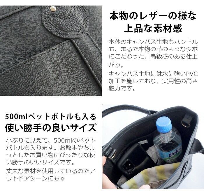 | 水にも強いPVC加工のキャンバス生地を使用 バッグ内にはゴールドのDカン3個付き 500mlのペットボトルも入ります |