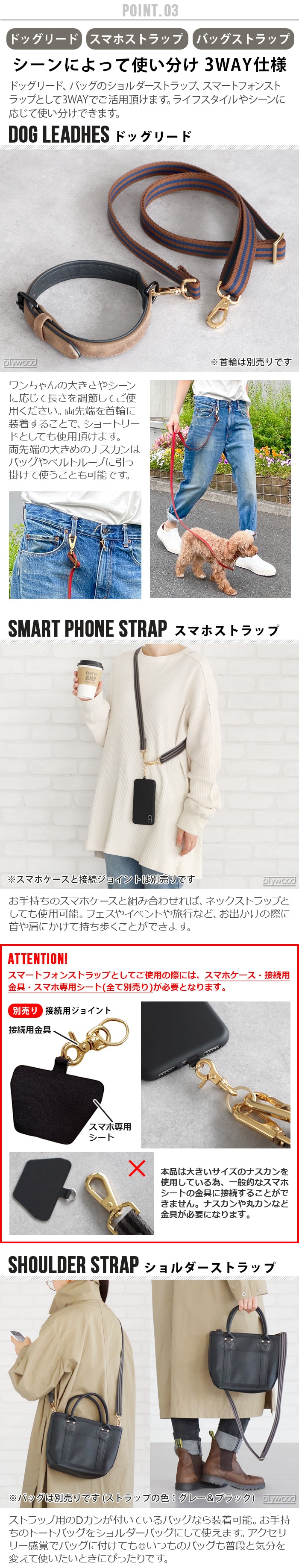 | スマホケース・接続ジョイント・バッグは付属しません。別売りです。 本品は大きいサイズのナスカンを使用している為、一般的なスマホ専用シートの金具に接続することができません。ナスカンや丸カンなど金具が必要になります。 カシメの色はストラップのカラーにより異なります。 |