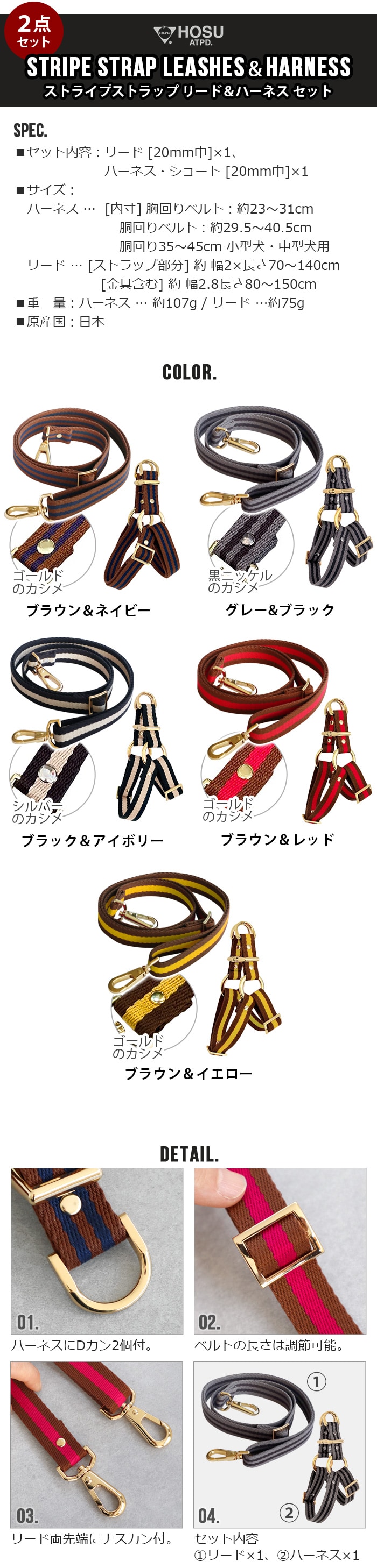 ホス ストライプストラップ&ハーネス HOSU LEASHES&HARNESSセット [20mm巾] 《ブラウン&ネイビー》 ハーネス リード 小型犬 中型犬 犬用 散歩 日本製 胴輪 首輪 太め 保護犬 ショルダーストラップ スマートホストラップ ストラップホルダー 長さ調節 調整 ギフト