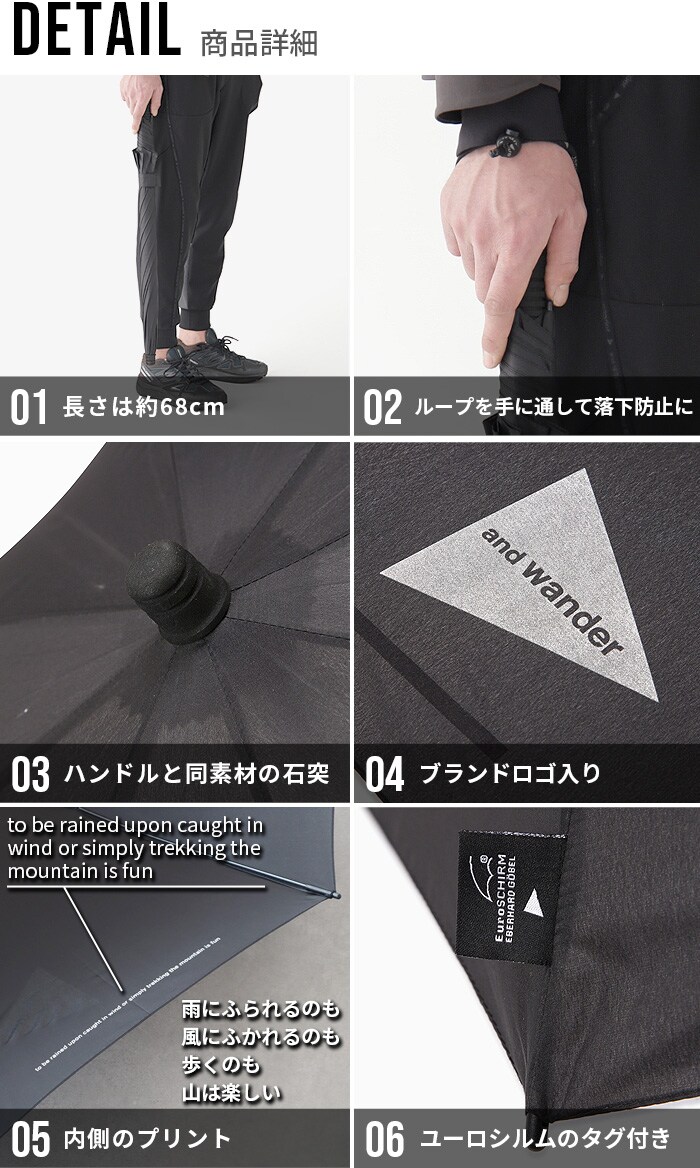 超軽量&高機能アンブレラ 機能的でファッショナブルなギアを多数発信する日本発のアウトドアブランド「and wander(アンドワンダー)」から、ドイツのメーカーEuroSCHIRM(ユーロシルム)とタッグを組んだ、高品質アンブレラのご紹介です。屋外アクティビティにも重宝する軽量さと、驚きの耐久性が魅力です。 |