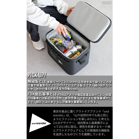 高い保冷効果のクーラーボックス 機能的でファッショナブルなギアを多数発信する日本発のアウトドアブランド「and wander(アンドワンダー)」から、ウォータープルーフクーラーのご紹介です。高い保冷効果が期待できるギミック搭載で、アウトドアライフをアシスト◎。容量たっぷり17Lで、しっかり実用的! |
