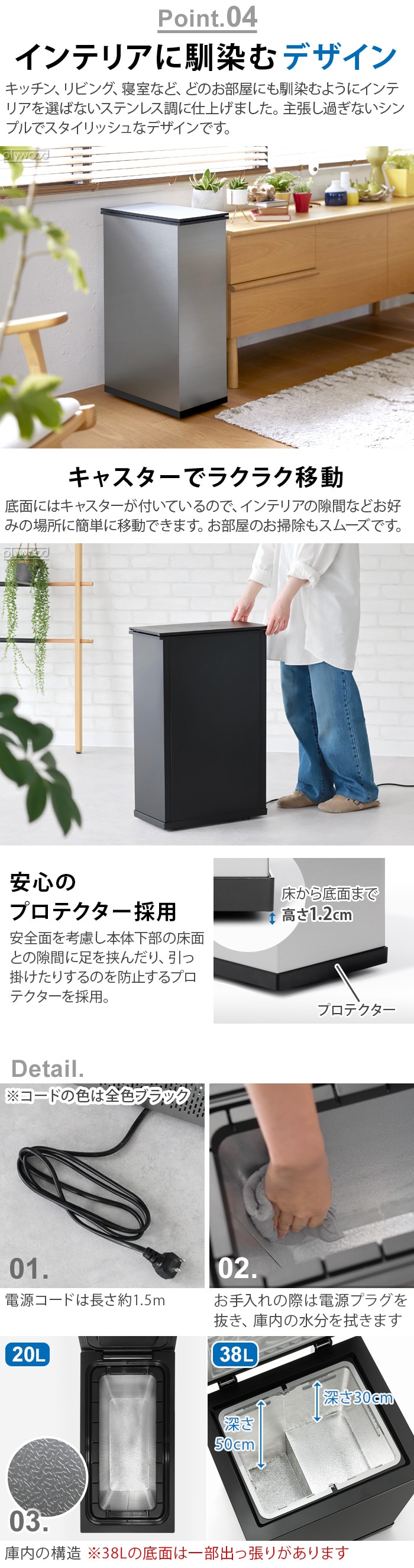 | [12L] 外寸:(約)幅23×奥行44.3×高さ53cm 内寸:(約)幅14.5×奥行34×高さ24cm [20L] 外寸:(約)幅23×奥行44.3×高さ69cm 内寸:(約)幅14×奥行34×高さ40cm [38L] 外寸:(約)幅45×奥行41.5×高さ69cm 内寸:(約)幅34×奥行27.4×高さ30・50cm 電源コード:(約)1.5m |