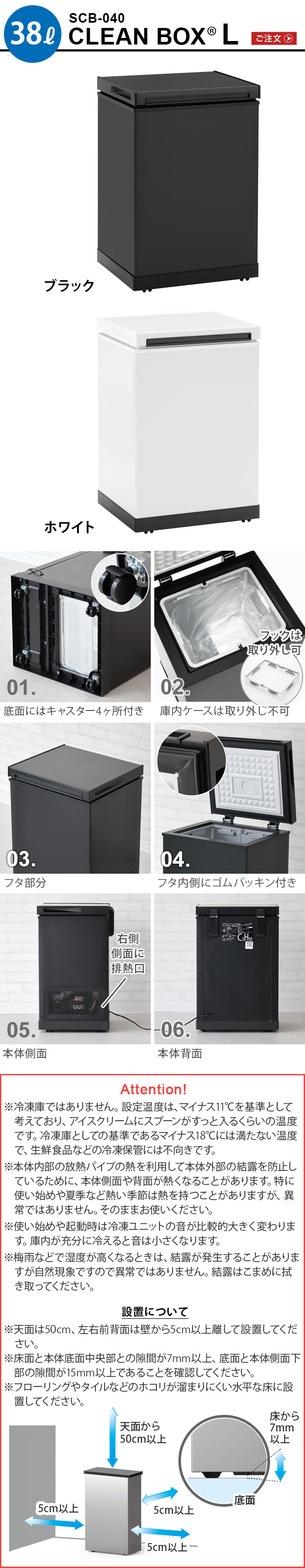 一度抜いた電源プラグは、すぐに差し込まないでください。最低でも「5分間の間隔」を空けてください。 移動するときは運転を止め、フタをテープなどで固定し、抱きかかえるように持って運んでください。移動・運搬の際に、絶対に本製品を倒さないでください。故障の原因になります。移動した後は「設置後最低30分間静置した後に電源プラグをコンセントに接続」してください。 壁から5cm以上、天井から50cm以上離して設置してください。 床面と本体底面中央部のすき間が15mm以上であることを必ず確認してください。 本製品は屋内用です。屋外には設置しないでください。 本製品は、ポータブル冷蔵庫・冷凍庫ではありません。車内など振動が激しい場所では使用しないでください。故障の原因になります。 冷凍庫ではありません。設定温度は、マイナス11℃を基準として考えており、アイスクリームにスプーンがすっと入るくらいの温度です。冷凍庫としての基準であるマイナス18℃には満たない温度で、生鮮食品などの冷凍保管には不向きです。 使い始めや起動時は冷凍ユニットの音が比較的大きく変わります。庫内が充分に冷えると音は小さくなります。 フタを開けたとき、使用部材などの匂いがすることがありますが、しばらく使用するうちに消えますのでそのままお使いください。 本体内部の放熱パイプの熱を利用して本体外部の結露を防止しているために、本体側面や背面が熱くなることがあります。特に使い始めや夏季など暑い時期は熱を持つことがありますが、異常ではありません。そのままお使いください。 |