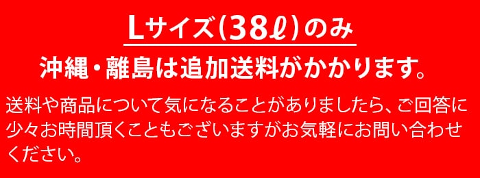 Lサイズ(38L)のみ 沖縄・離島は追加送料がかかります。 送料や商品について気になることがありましたら、ご回答に少々お時間頂くこともございますがお気軽にお問い合わせください。 |
