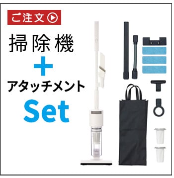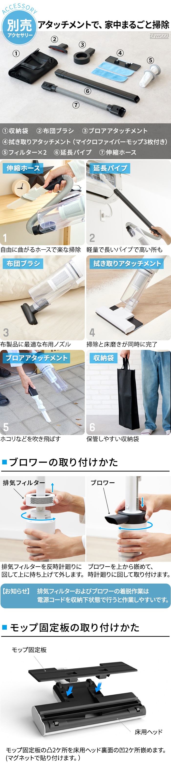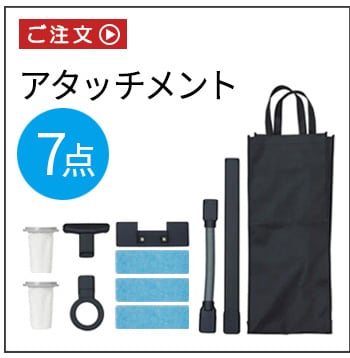 延長パイプ×1、伸縮ホース×1、ブロワー×1、布団ノズル×1、モップ固定板×1、マイクロファイバーモップ×3、フィルター×2、収納袋×1