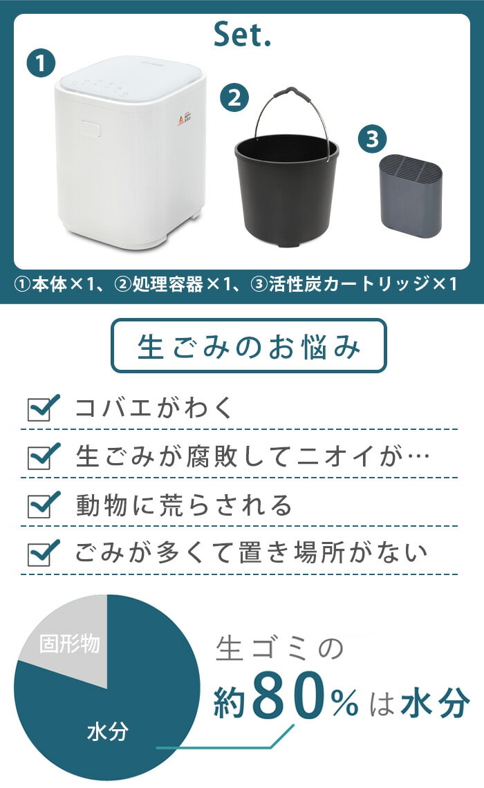 | 本体×1、処理容器×1、活性炭カートリッジ×1 |