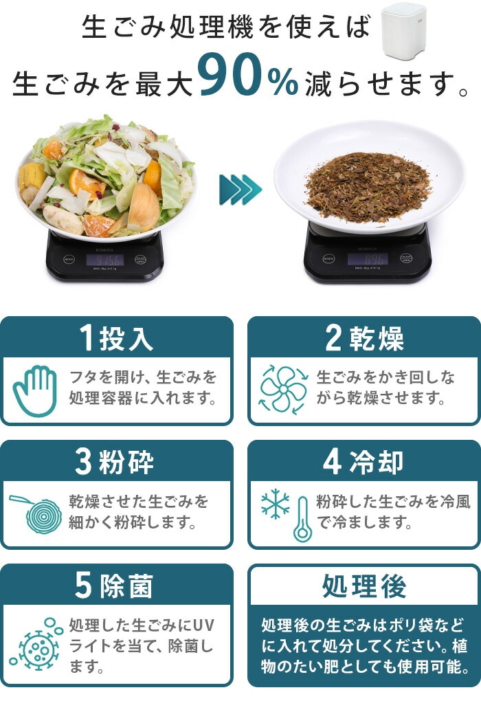 気になるニオイも抑える 生ごみ処理機 家庭で出る生ごみの重さを最大90%減らす「スマート生ごみ処理機 GYUTTO」のご紹介です。 生ごみを入れてスイッチを入れるだけで、短時間で乾燥させて量を減らし、UVライトでしっかりと除菌してニオイの発生も防ぎます。処理された生ごみは枯葉のようになり捨てやすく、植物の栄養になるたい肥としても使用可能。クリーンモード搭載でお手入れも簡単です。シンプルなデザインでお部屋に馴染みます。 |