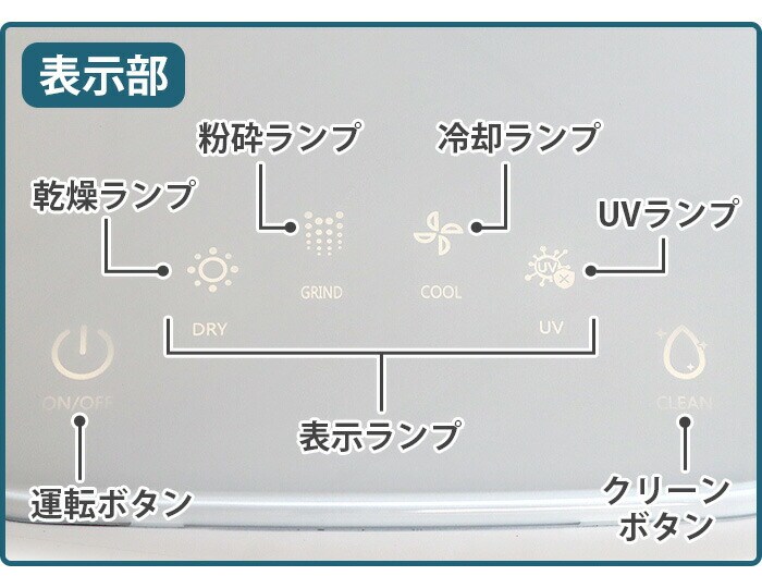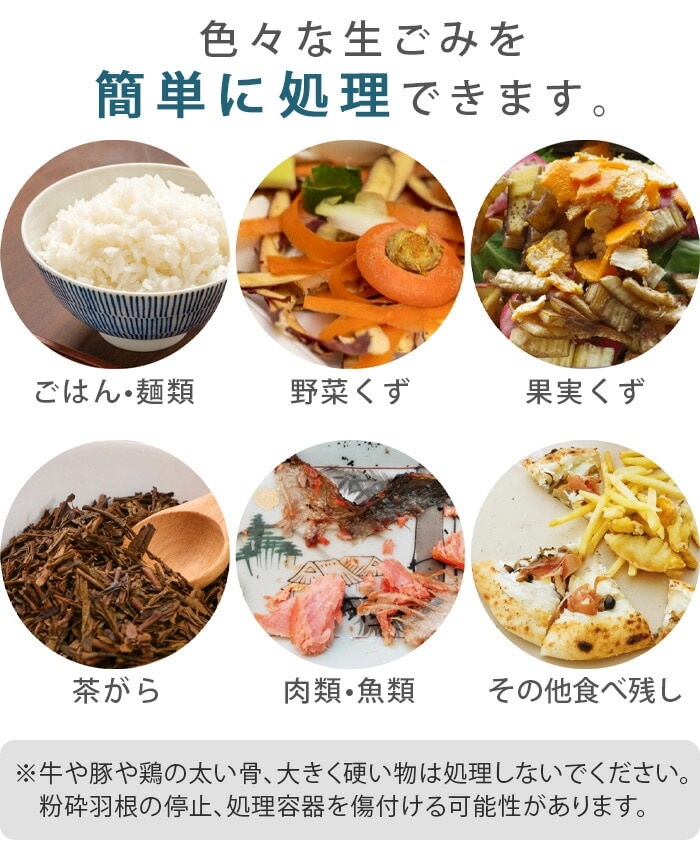 ■入れられるもの ごはん・麺類、野菜くず、果実くず、茶がら、肉類・魚類、その他食べ残し ■入れられないもの 牛や豚や鶏の太い骨、大きく硬い物は処理しないでください。粉砕羽根の停止、処理容器を傷付ける可能性があります。 酒類やアルコール分を含むもの 食用油や油脂類(多量) 多量の柑橘類の皮(みかんやオレンジなど) |