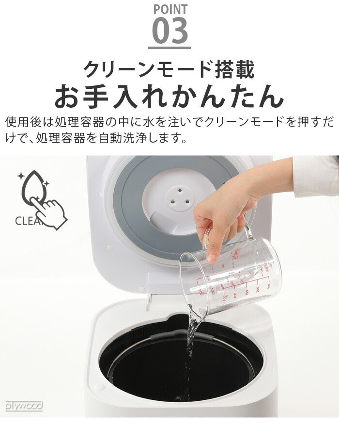 | 家庭用100V電源(容量15A-1500W)を単独で使用する。 カーテンなど燃えやすいものからは、1m以上離してください。 プロパンガスなど引火しやすいものからは、2m以上離してください。 排気口の近くに、ものや植物を置かないでください。 運転中は高温になるため、ふたを開けないでください。 本体を水で洗ったり、丸洗いしないでください。 処理容器の中で生ごみが腐敗しないよう早めに処理してください。 腐敗した生ごみは投入しないでください。 水分を十分に切ってから投入してください。 |
