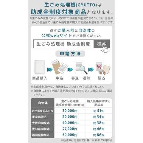 | 助成金制度については、各自治体によって異なります。「生ごみ処理機 助成金制度」について、必ずご購入前に、各自治体にご確認ください。
