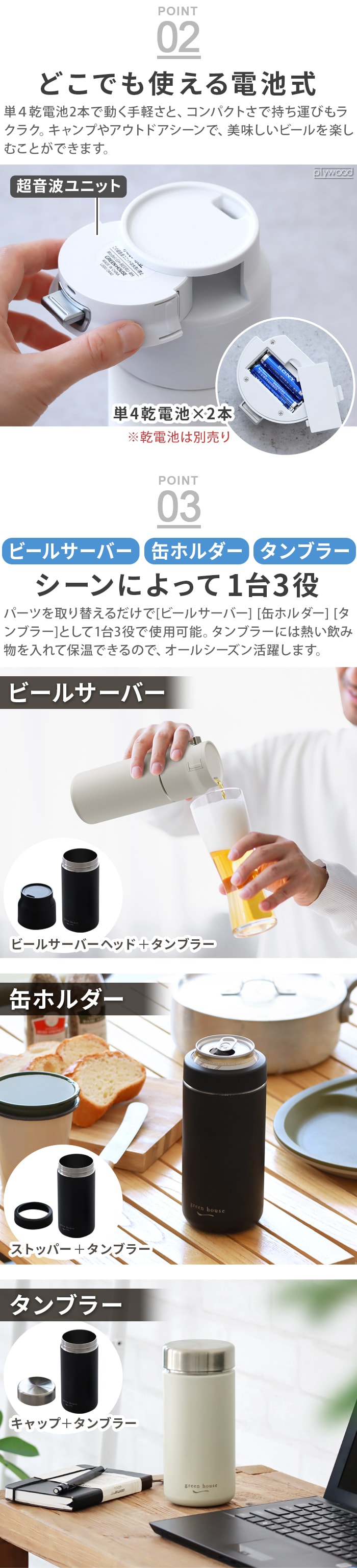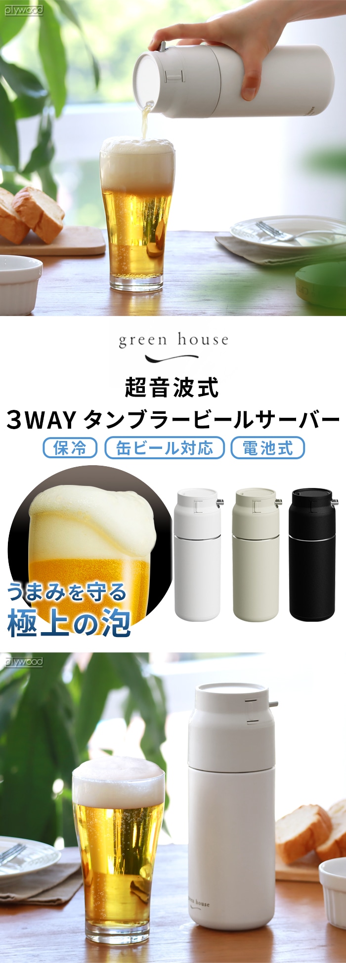グリーンハウス 3WAYタンブラービールサーバー GREEN HOUSE ≪ホワイト GH-BEERU-WH≫ 缶ビール用 保冷 電池式 ビアサーバー 泡立て 超音波 クリーミー 保冷 缶ホルダー 家庭用 おいしい 父の日 ギフト 結婚祝い