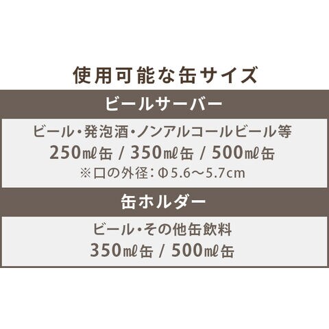 | ≪ビールサーバー≫ ビール・発泡酒・ノンアルコールビール等 250ml缶/350ml缶/500㎖缶 ※口の外径:Φ5.6~5.7cm ≪缶ホルダー≫ ビール・その他缶飲料 350ml缶/500ml缶 ※口の外径:Φ5.6~5.7cm |