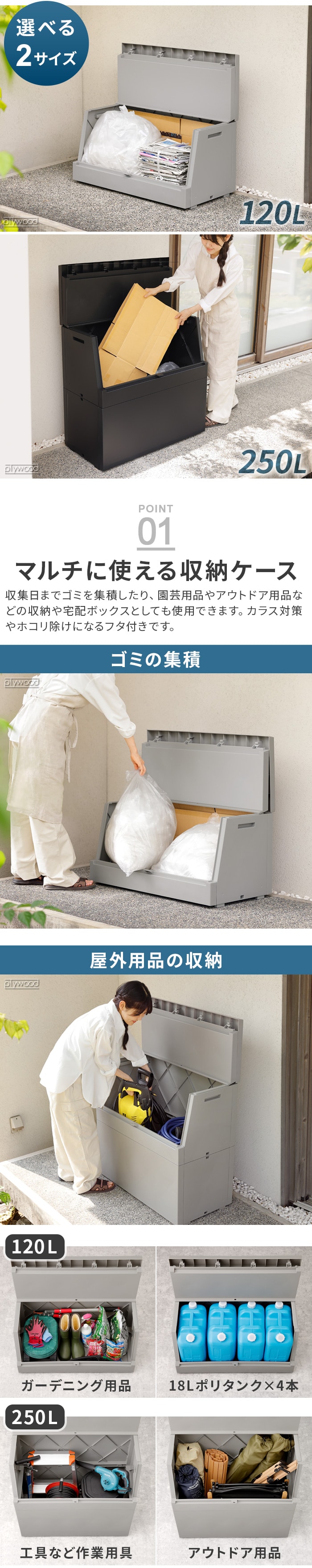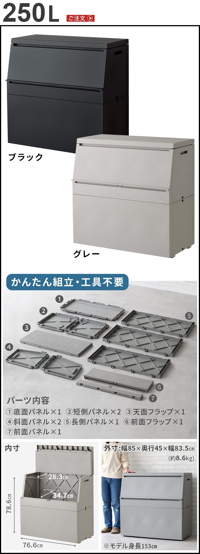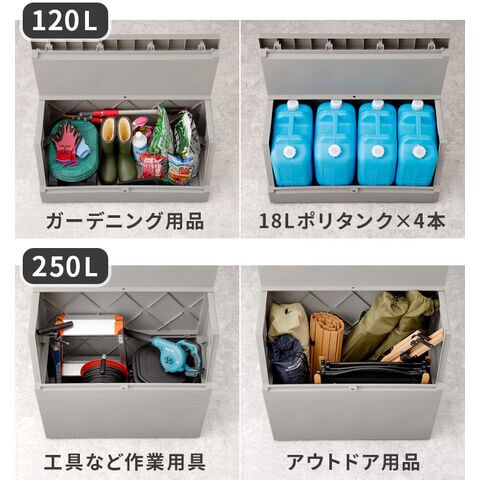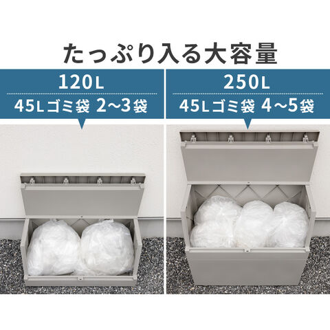 | 120L:(約)幅85×奥行45×高さ44.5cm(フタを空けた際:高さ77cm) 250L:(約)幅85×奥行45×高さ83.5cm(フタを空けた際:高さ116cm) |