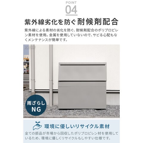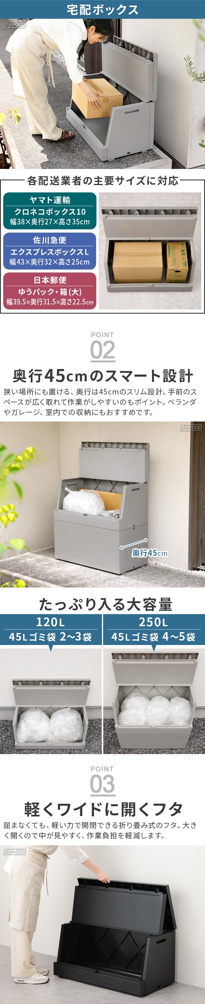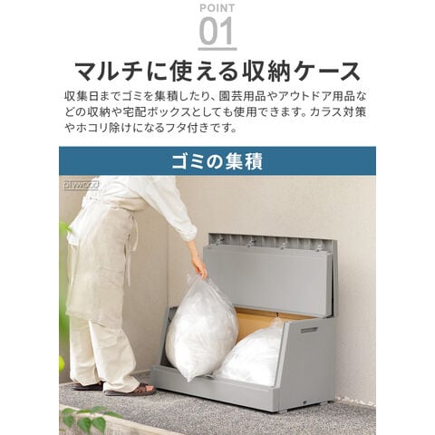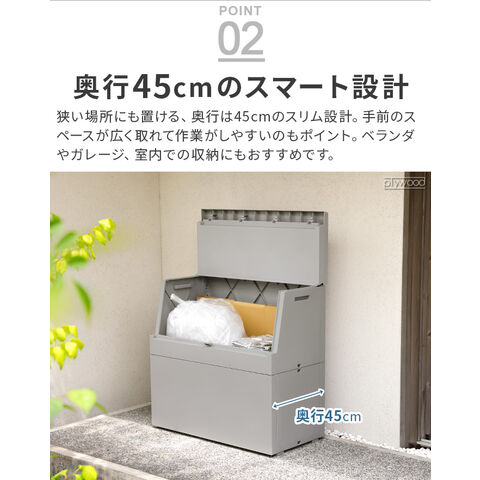 マルチに使える 屋外ストッカー 景観を損なわないシンプルデザインの屋外ストッカーの登場です。収集日までゴミを管理したり、ガーデニングなどの屋外用品の収納や、宅配ボックスとしても使用できます。奥行45cmのスマートな設計でベランダ収納やガレージや家の中での収納にもおすすめです。※防水構造ではありません。 |