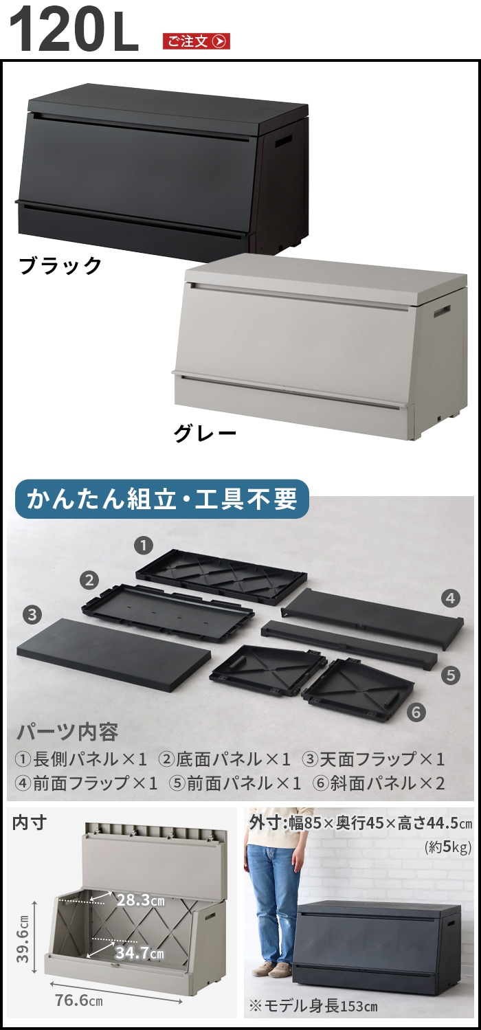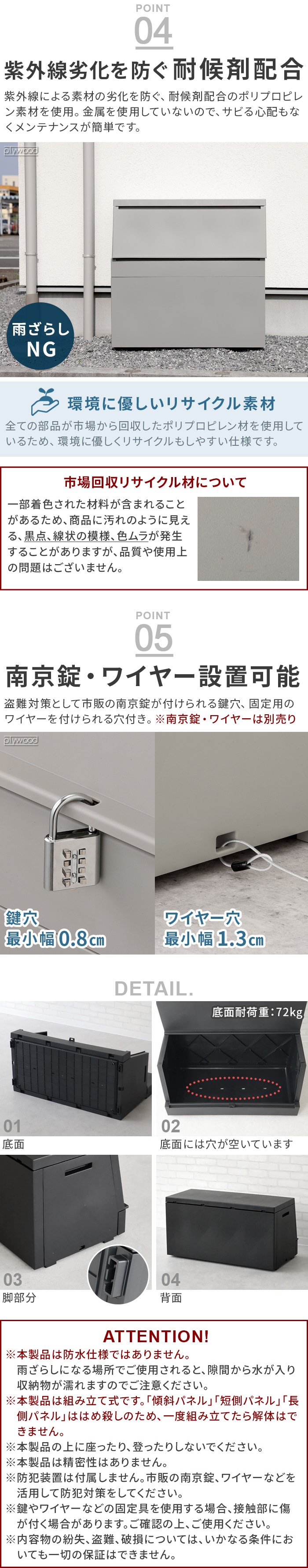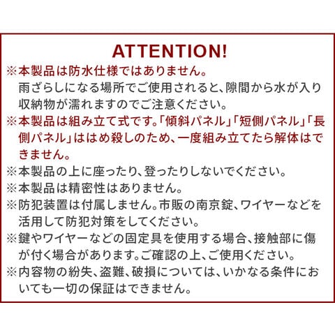 本製品は防水仕様ではありません。雨ざらしになる場所でご使用されると、隙間から水が入り収納物が濡れますのでご注意ください。 本製品は組み立て式です。「傾斜パネル」「短側パネル」「長側パネル」ははめ殺しのため、一度組み立てたら解体はできません。 本製品の上に座ったり、登ったりしないで下しないでください。 本製品は精密性はありません。 防犯装置は付属しません。市販の南京錠、ワイヤーなどを活用して防犯対策をしてください。 鍵やワイヤーなどの固定具を使用する場合、接触部に傷 が付く場合があります。ご確認の上、ご使用ください。 内容物の紛失、盗難、破損については、いかなる条件においても一切の保証はできません。 一部着色された材料が含まれることがあるため、商品に汚れのように見える、黒点、線状の模様、色ムラが発生することがありますが、品質や使用上の問題はございません。 |
