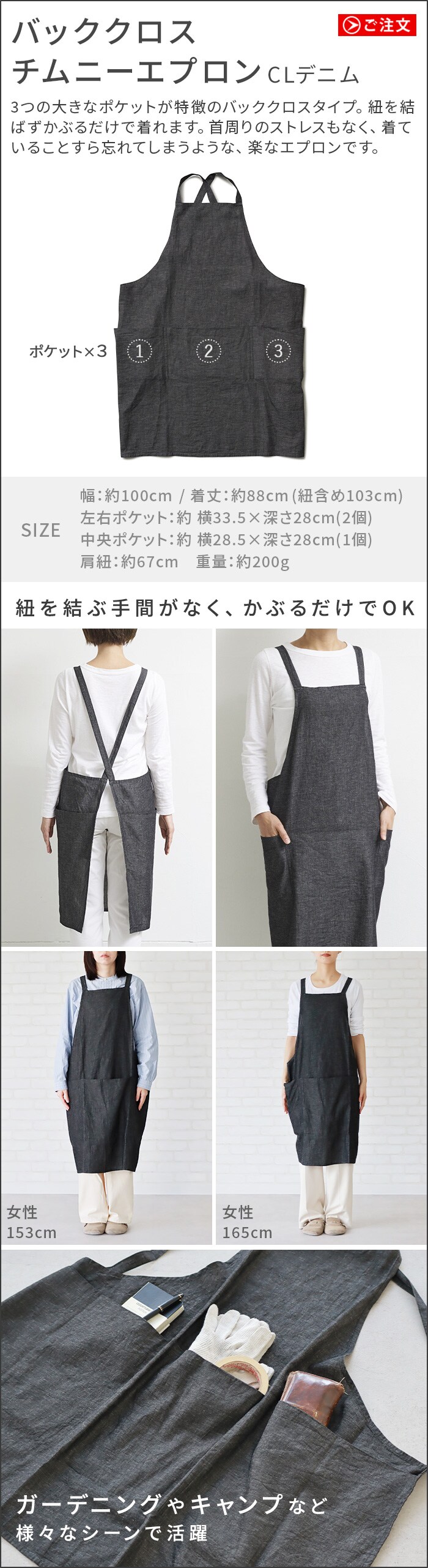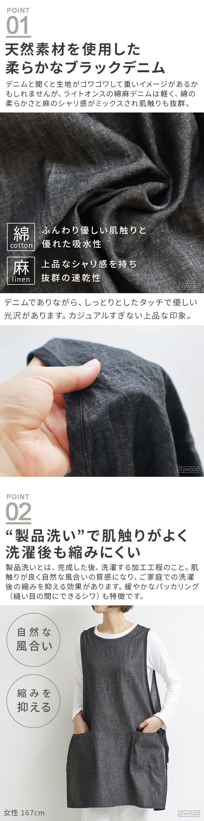 柔らかく上品な デニム生地のエプロン SUNNY LOCATIONのエプロンから、柔らかい綿麻デニムを使用したブラックデニムシリーズが登場。長財布も入る大きめのポケットつき。天然素材の綿麻生地は、綿の柔らかさと麻のシャリ感がミックスされ、上品な光沢がありながらソフトな仕上がり。日々の暮らしの中で気分が上がるような、こだわりのエプロンです。 |