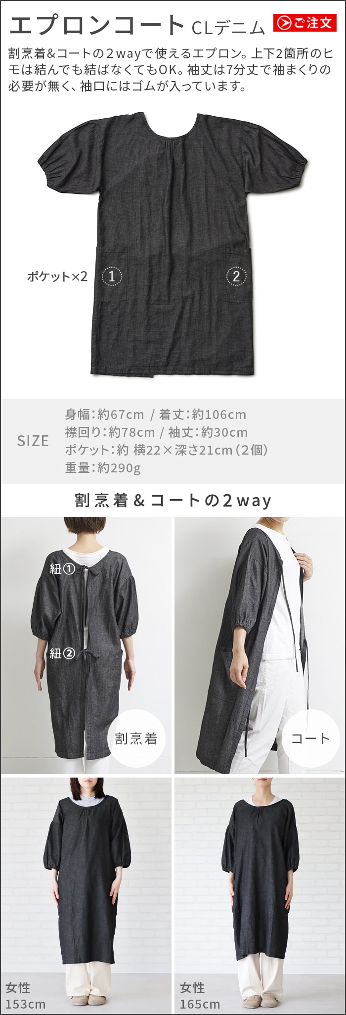≪エプロンコート≫ 身幅:約67cm 着丈:約106cm 襟回り:約78cm 袖丈:約30cm ポケット:約 横22×深さ21cm(2個付) 重さ:約290g ≪ギャザーエプロン≫ 幅:約130cm 着丈:約96cm(紐含め109cm) 腰紐:約90cm 肩紐:約51cm ポケット:約 横19×深さ18.5cm(2個付) 重さ:約200g ≪ビブエプロン≫ 幅:約70cm 着丈:約87cm 腰紐:約45cm ポケット:約 横15.5×深さ17.5cm(2個付) 重さ:約180g ≪バッククロスチムニーエプロン≫ 幅:約100cm 着丈:約88cm(紐含め103cm) 肩紐:約67cm 左右ポケット:約 横33.5×深さ28cm(2個) 中央ポケット:約 横28.5×深さ28cm(1個) 重さ:約200g |