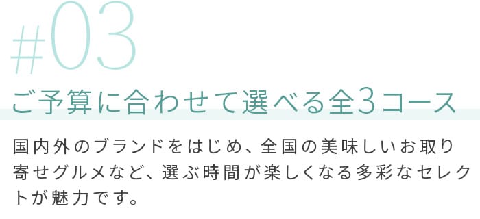 | ル・クルーゼ/ラッセルホブス/象印/作山窯/ブラックアンドデッカー/ムアツ/ウチノ/モリス・ギャラリー/オムロン/パナソニック/アンカー/ブリオ/ユナイテッドアローズ/アーバンリサーチ/アンダーアーマー/静岡県産うなぎ蒲焼/徳島 割烹吟月/涸沼産大和しじみ/ずわいがに/長崎県五島列島産 車海老/プリマハム/三輪素麺/〈ビストア〉焦がしカラメルアイス/とらふぐ/鹿児島県産黒毛和牛/北海道仁木産さくらんぼ南陽/京都・魚三楼/福岡県産 あまおう苺/〈秋田・桧山ファーム〉秋田県桧山産 桧山こまち/パンソン シェフパティシエ |