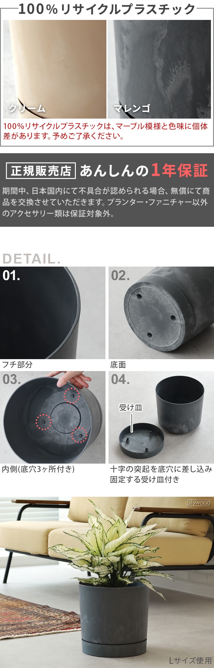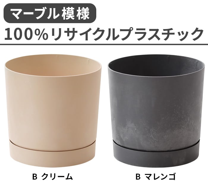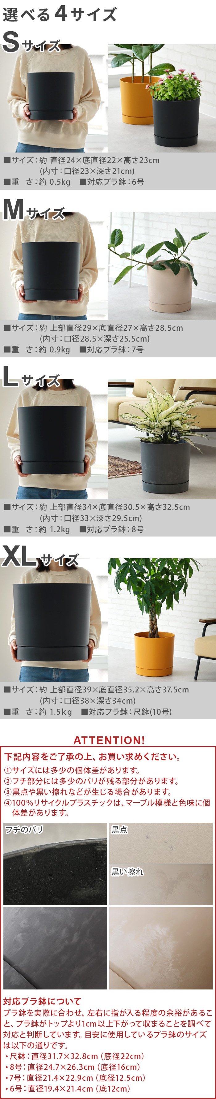 | 100%リサイクルプラスチックは、マーブル模様と色味に個体差があります。 フチ部分には多少の欠けやバリが残る部分があります。 黒点や黒い擦れなどが生じる場合があります。 サイズには多少の個体差があります。 植物は付属しておりません。 |