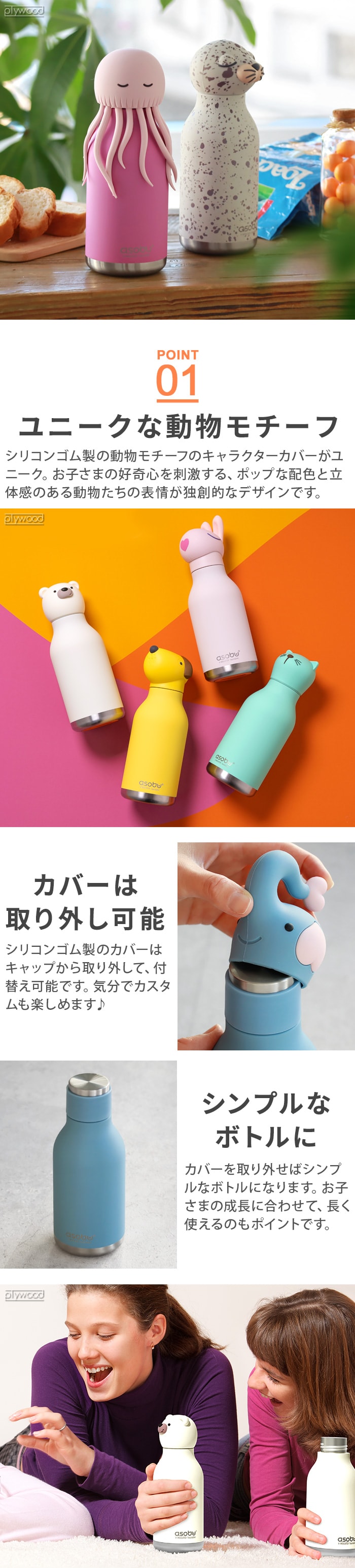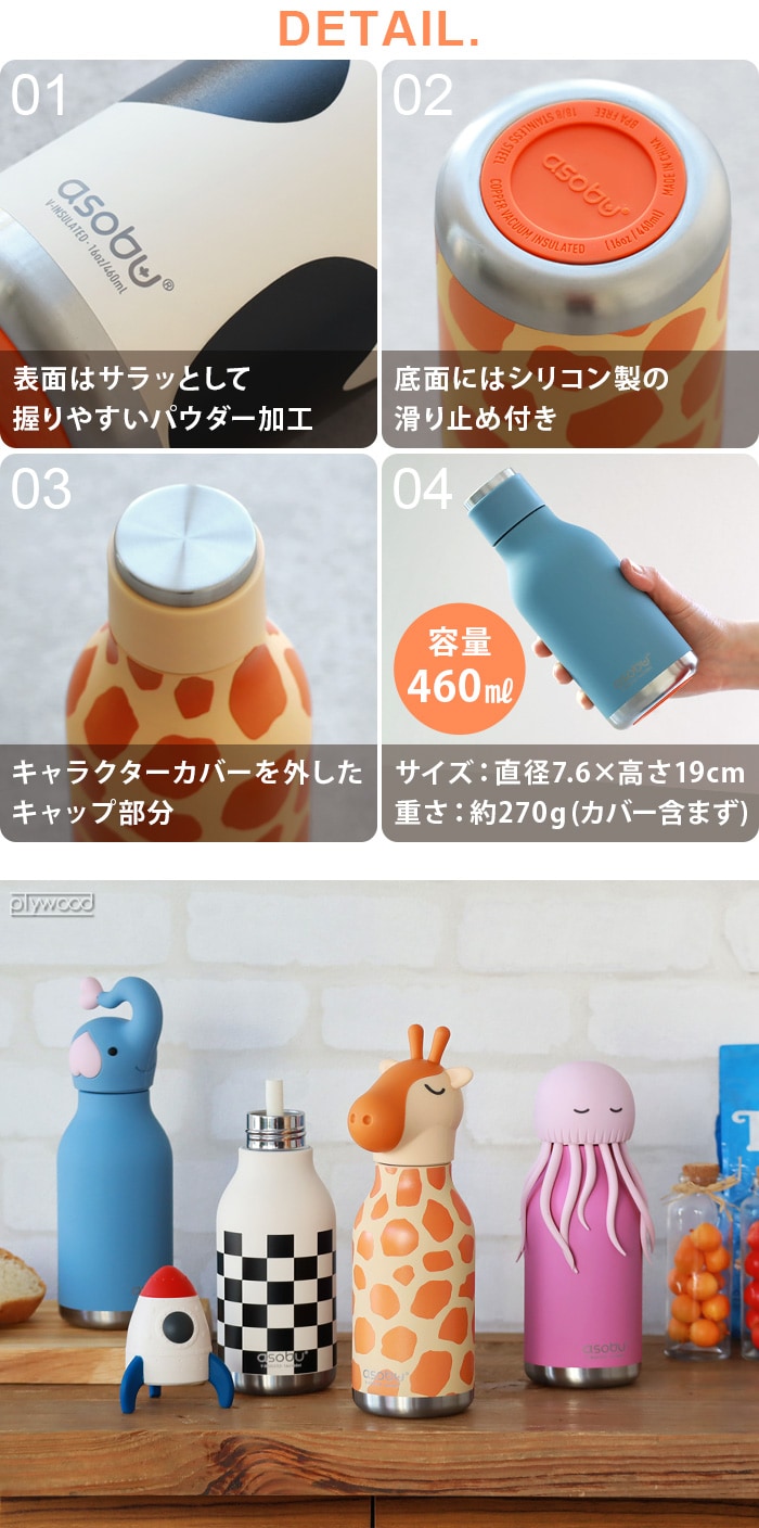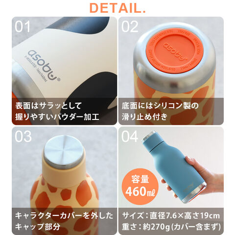【カバー含む】 ベア:(約)直径7.6×高さ20.5cm バニー:(約)直径7.6×高さ22.5cm キャット:(約)直径7.6×高さ20.5cm ウシ:(約)直径7.6×高さ22cm ダイナソー:(約)直径8×高さ21.5cm ドッグ:(約)直径8×高さ21cm アヒル:(約)直径8×高さ21.5cm ゾウ:(約)直径7.6×高さ23cm キツネ:(約)直径8.5×高さ21cm キリン:(約)直径9×高さ24cm クラゲ:(約)直径8.5×高さ20.5cm コアラ:(約)直径8.2×高さ20.5cm パンダ:(約)直径7.6×高さ20.5cm ペンギン:(約)直径7.6×高さ21cm ピッグ:(約)直径7.6×高さ20.5cm ロケット:(約)直径8×高さ23cm レッサーパンダ:(約)直径8×高さ20cm ヒツジ:(約)直径7.6×高さ21.5cm アザラシ:(約)直径8×高さ20.5cm ユニコーン:(約)直径8×高さ23.5cm ボトルのみ(カバー含まず):(約)直径7.6×高さ19cm 口径:約3.2cm |