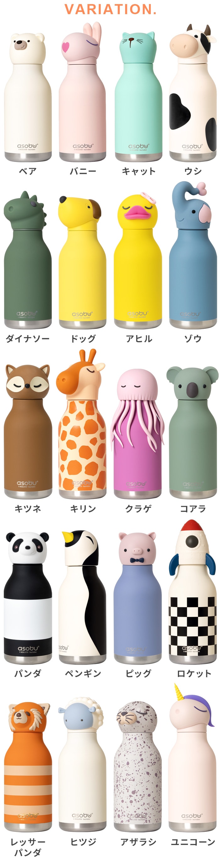 【カバー含む】 ベア:約315g バニー:約330g キャット:約315g ウシ:約325g ダイナソー:約325g ドッグ:約320g アヒル:約345g ゾウ:約340g キツネ:約345g キリン:約340g クラゲ:約355g コアラ:約330g パンダ:約330g ペンギン:約325g ピッグ:約330g ロケット:約330g レッサーパンダ:約320g ヒツジ::約350g アザラシ:約330g ユニコーン:約330g ボトルのみ(カバー含まず):約270g |