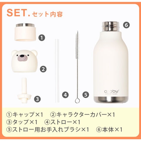 | 本体×1、キャップ×1、キャラクターカバー×1、タップ×1、ストロー×1、ストロー用お手入れブラシ×1 |