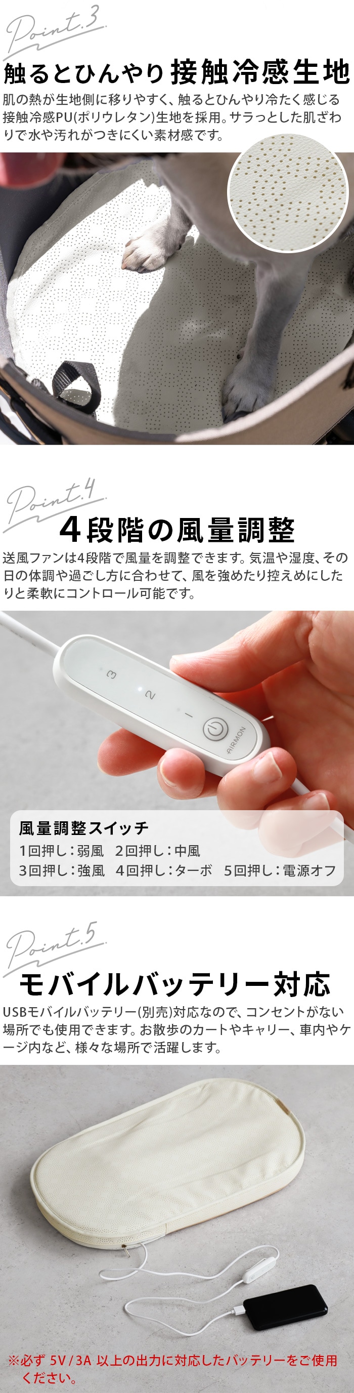 | 4段階の風量調整可能 USBモバイルバッテリー(別売り)対応 ※必ず5V/3A以上の出力に対応したバッテリーをご使用ください。 バッテリー用ポーチ付き |