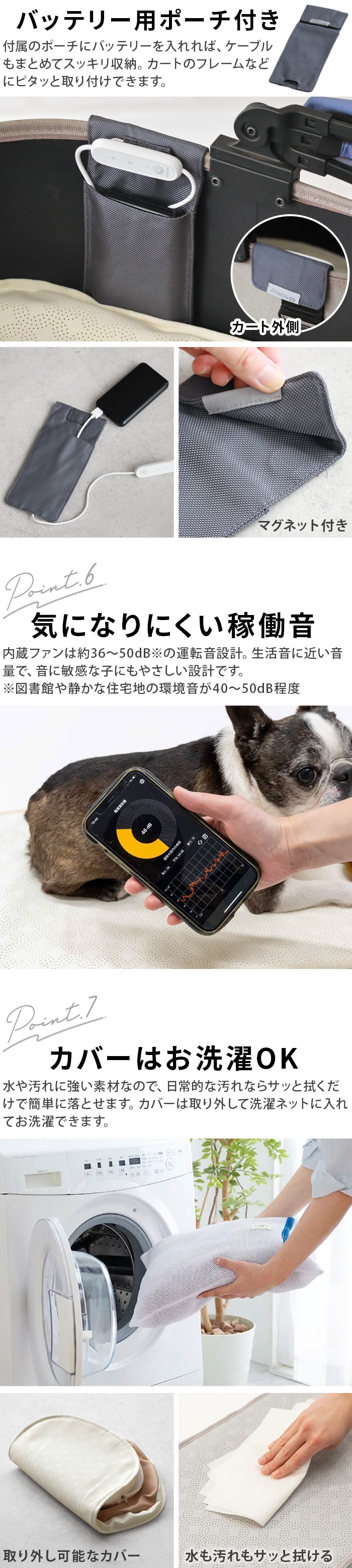 | カバーは取り外して手洗い、または洗濯ネット使用でソフト洗いが可能です。 ・中性洗剤を使用してください。 ・ファンは必ず取り外してから洗濯してください。 ・乾燥機、漂白剤、アイロン、ドライクリーニングは使用できません。 ・日陰で自然乾燥し、完全に乾いてから再装着してください。 |
