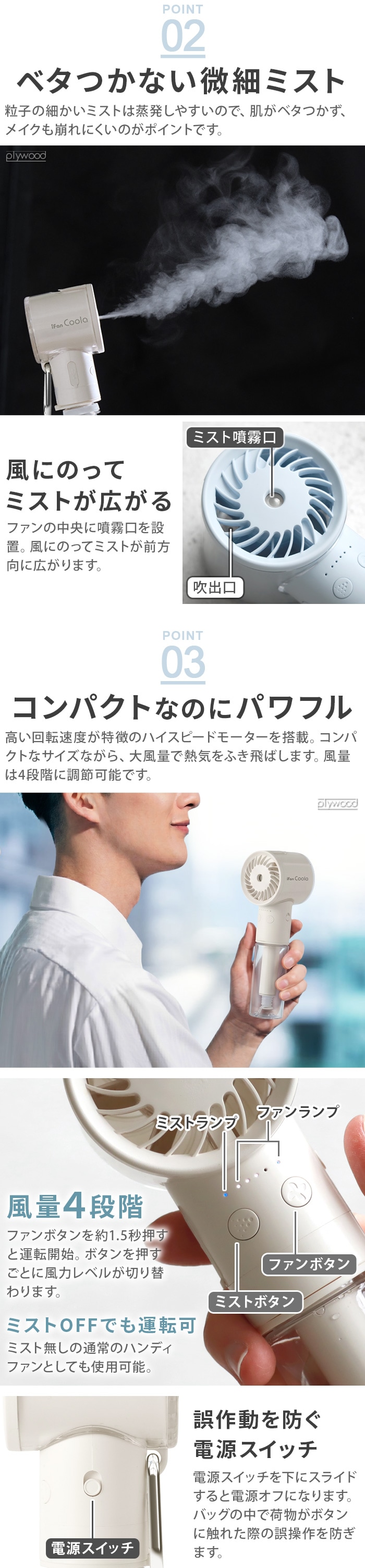 | 風量4段階調節 1時間自動電源オフ(ファン+ミスト使用時) ミストON/OFF機能 |