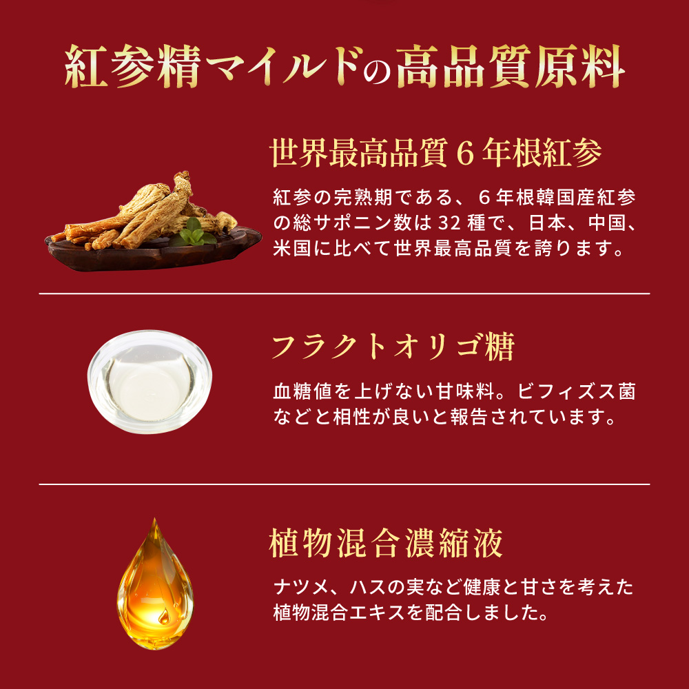 | 原材料名 | 水あめ、マルトデキストリン、フラクトオリゴ糖、紅参濃縮液、植物混合濃縮液(陳皮、アマドコロ、ナツメ、龍眼肉、ハスの実、シナモン)、ナツメエキス、霊芝エキス/グレープフルーツ種子湧出物 |