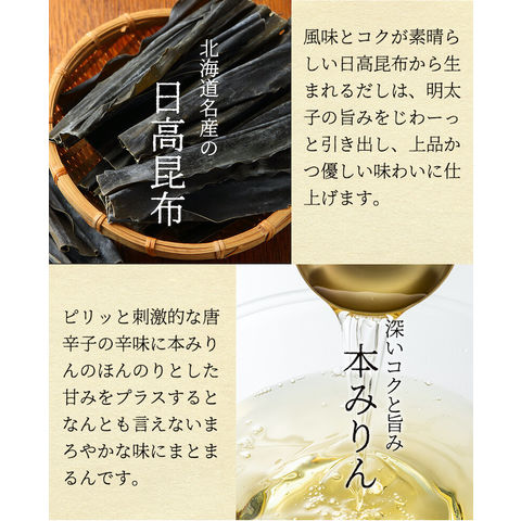 | 原材料 | すけとうだらの卵巣(ロシア又はアメリカ)、食塩、本みりん、発酵調味料、昆布エキス、かつお節エキス、米酢、唐辛子、魚醤、甘味料(ソルビット)、調味料(アミノ酸等)、酸化防止剤(ビタミンC)、ナイアシン、発色剤(亜硫酸Na) |