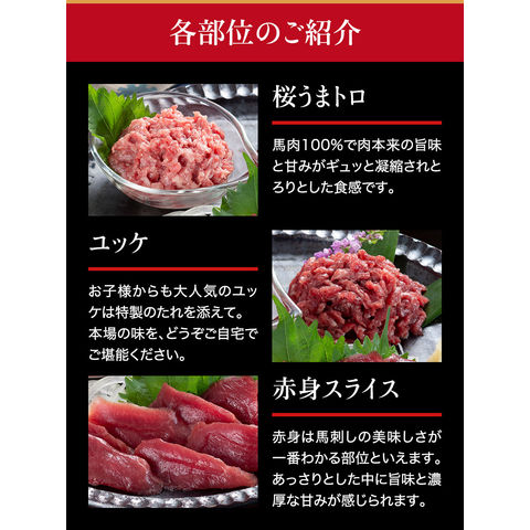 桜うまトロ個食パック×2セット(桜うまトロ60g・万能ソース15g) ユッケ個食パック×2セット(馬肉線切り50g・ユッケのタレ15g) 赤身スライス個食パック×2セット(赤身スライス40g・タレ5ml) |